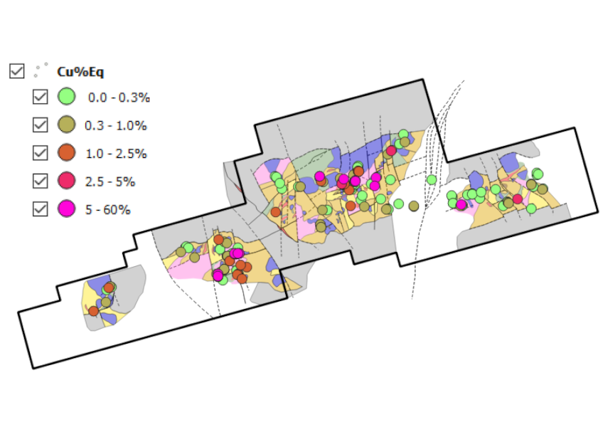 High grade occurrences of copper and cobalt occur at the surface of the Monster Property. These occurrences grade up to 23% copper and 9% cobalt. Gold (up to 3.4 g/t) is associated with cobalt and Silver (up to 53 g/t) is associated with copper.